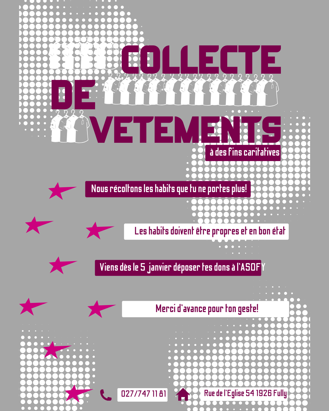Léonie, une jeune de la commune, propose une soirée friperie dansante et caritative. Des vêtements seront récoltés gratuitement, puis revendus dans une ambiance musicale. L’intégralité des bénéfices sera reversée à une association soutenant les victimes de conflits dans le monde. L’AsoFy accompagne et encadre la réalisation de ce projet solidaire.